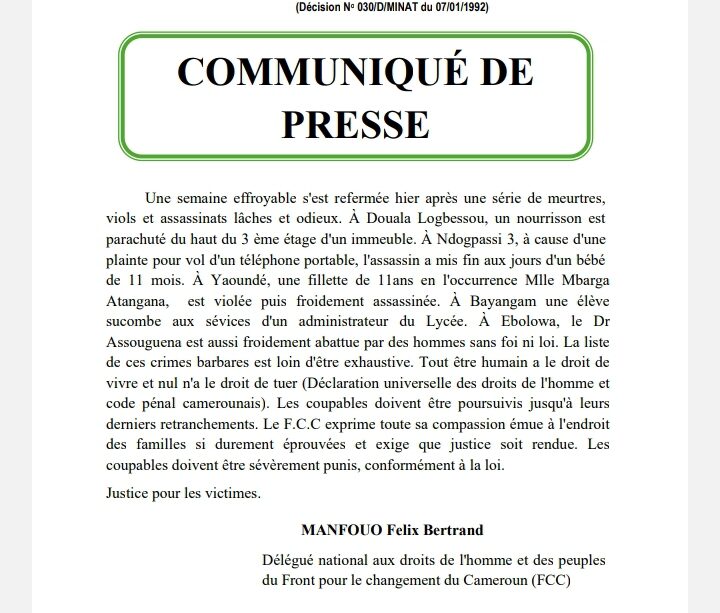 « Une semaine effroyable s’est refermée hier après une série de meurtres, viols et assassinats lâches et odieux. À Douala Logbessou, un nourrisson est parachuté du haut du 3 ème étage d’un immeuble. À Ndogpassi 3, à cause d’une plainte pour vol d’un téléphone portable, l’assassin a mis fin aux jours d’un bébé de 11 mois. À Yaoundé, une fillette de 11ans en l’occurrence Mlle Mbarga Atangana, est violée puis froidement assassinée. À Bayangam une élève sucombe aux sévices d’un administrateur du Lycée. À Ebolowa, le Dr Assouguena est aussi froidement abattue par des hommes sans foi ni loi. La liste de ces crimes barbares est loin d’être exhaustive. Tout être humain a le droit de vivre et nul n’a le droit de tuer (Déclaration universelle des droits de l’homme et code pénal camerounais). Les coupables doivent être poursuivis jusqu’à leurs derniers retranchements.