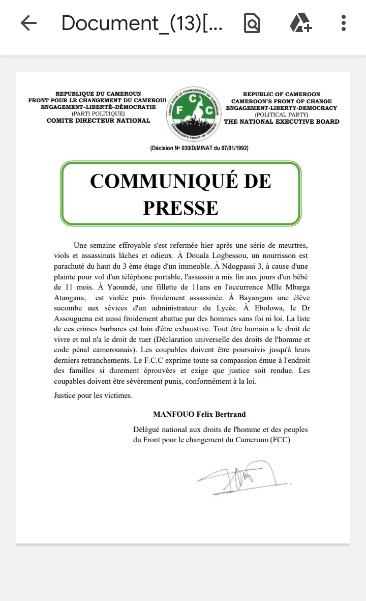 Cameroun : Le Front pour le changement du Cameroun (FCC) tire la sonnette d’alarme sur une série de meurtres, viols et assassinats lâches et odieux
