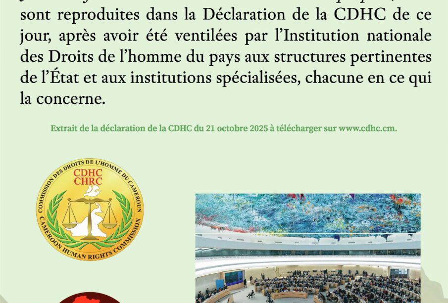 Par ailleurs, la Commission des Droits de l’Homme du Cameroun (CDHC) relève que sur les 220 recommandations acceptées par l’Etat à l’occasion de l’adoption du Rapport du passage du Cameroun au 4e cycle de l’Examen périodique universel (EPU) le 26 mars 2024, huit sont en consonance avec la thématique de l’édition 2025 de la JADHP ; elles sont reproduites dans la Déclaration de la CDHC de ce jour, après avoir été ventilées par l’Institution nationale des Droits de l’homme du pays aux Structures pertinentes de l’Etat et aux institutions spécialisées, chacune en ce qui la concerne, de la manière suivante : la recommandation invitant à « traiter les plaintes relatives à des disparitions forcées et à des exécutions extrajudiciaires et lutter contre I ‘impunité » qui rejoint pleinement l’esprit de la présente Journée africaine, axée sur la justice et les réparations pour les victimes de violations graves des Droits de l’homme et réaffirme la nécessité de restaurer la dignité des victimes et la confiance des citoyens dans les institutions de justice ; elle a été adressée au MINJUSTICE, au ministère de la Défense (MINDEF) et à la Délégation Générale à la Sûreté nationale (DGSN) ;