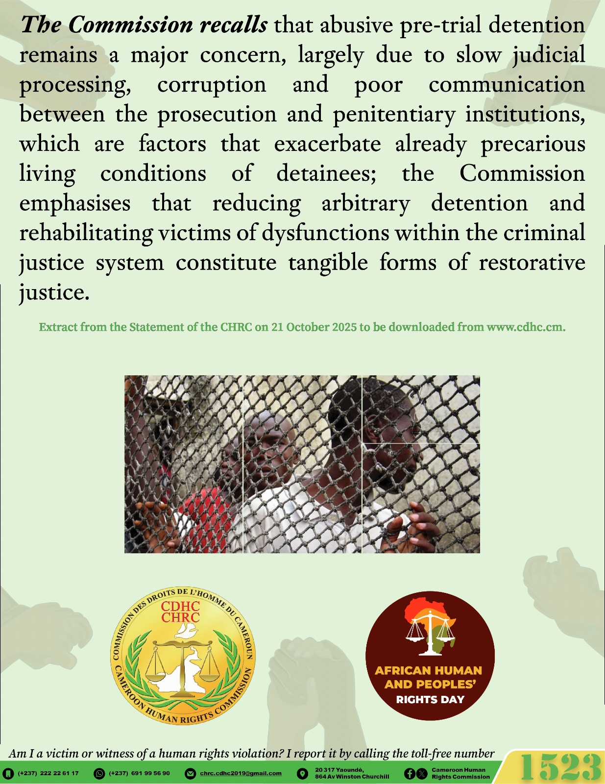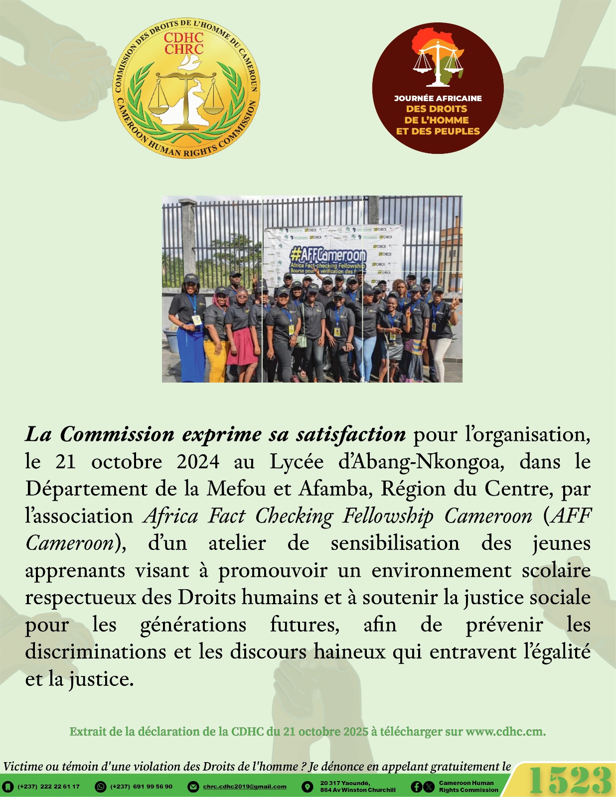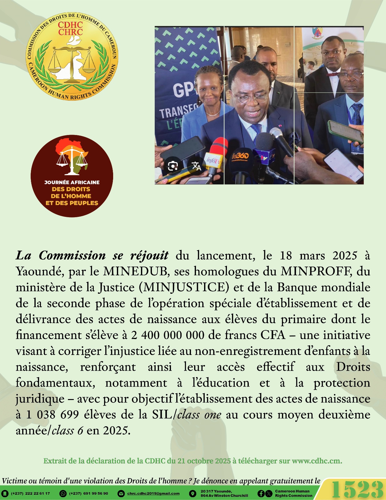 Par ailleurs, la Commission des Droits de l’Homme du Cameroun (CDHC) relève que sur les 220 recommandations acceptées par l’Etat à l’occasion de l’adoption du Rapport du passage du Cameroun au 4e cycle de l’Examen périodique universel (EPU) le 26 mars 2024, huit sont en consonance avec la thématique de l’édition 2025 de la JADHP ; elles sont reproduites dans la Déclaration de la CDHC de ce jour, après avoir été ventilées par l’Institution nationale des Droits de l’homme du pays aux Structures pertinentes de l’Etat et aux institutions spécialisées, chacune en ce qui la concerne, de la manière suivante : la recommandation invitant à « traiter les plaintes relatives à des disparitions forcées et à des exécutions extrajudiciaires et lutter contre I ‘impunité » qui rejoint pleinement l’esprit de la présente Journée africaine, axée sur la justice et les réparations pour les victimes de violations graves des Droits de l’homme et réaffirme la nécessité de restaurer la dignité des victimes et la confiance des citoyens dans les institutions de justice ; elle a été adressée au MINJUSTICE, au ministère de la Défense (MINDEF) et à la Délégation Générale à la Sûreté nationale (DGSN) ;