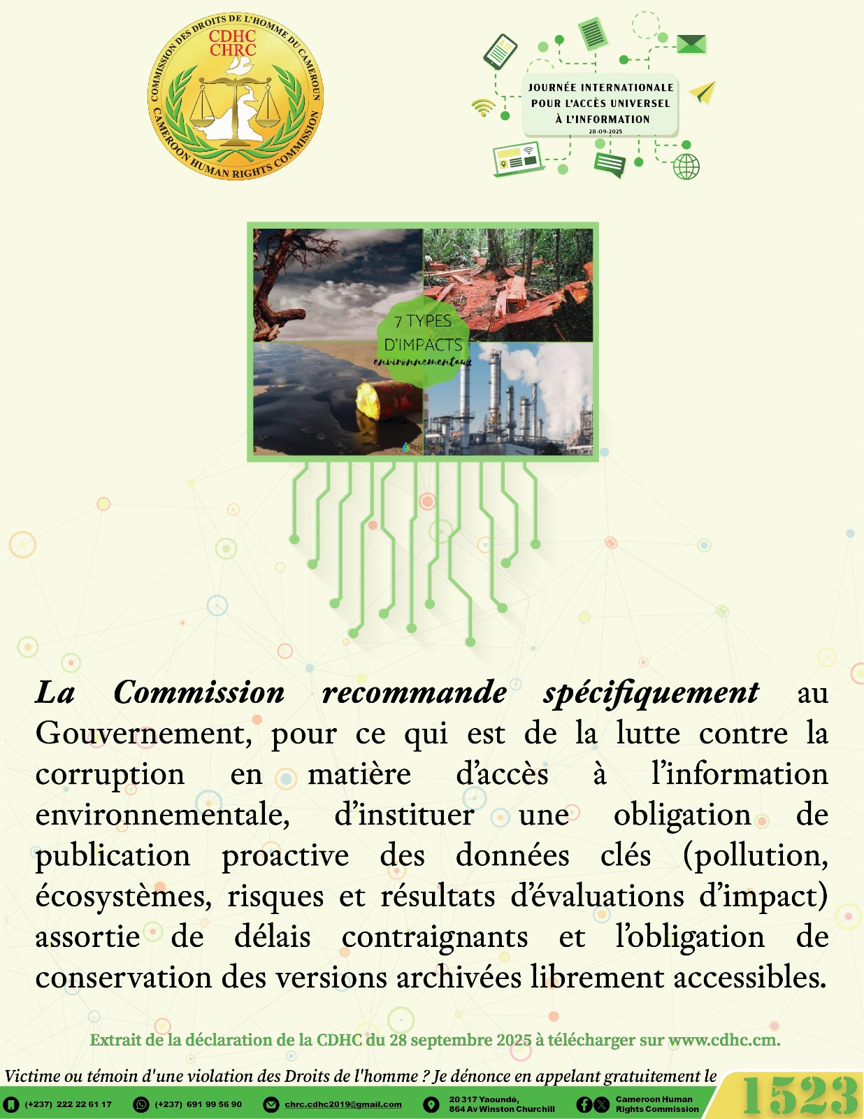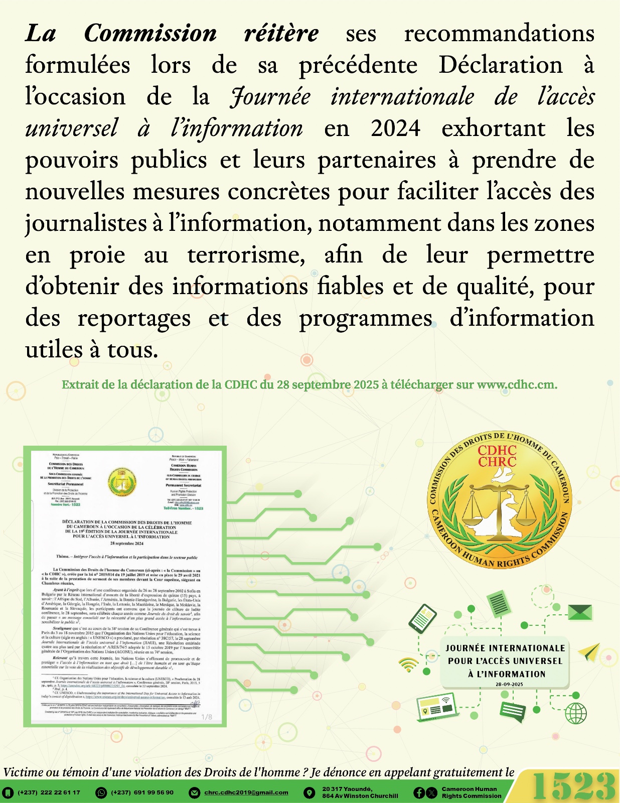 « Garantir l’accès à l’information environnementale à l’ère du numérique ». C’est le thème de cette journée. Dans une déclaration de la Commission des Droits de l’Homme du Cameroun (CDHC), l’institution relève que la célébration de la JIAUI poursuit plusieurs objectifs essentiels, notamment : rappeler que l’accès à l’information n’est pas un privilège, mais un droit universel indispensable à l’exercice de nombreux autres Droits de l’homme, qu’ils soient civils, politiques, sociaux ou culturels ; Souligner que ce droit doit être garanti par des lois nationales solides et mis en œuvre de manière effective ; Mettre en lumière le rôle de l’information dans la transparence de l’action publique, la responsabilité des gouvernants et la lutte contre la corruption ; Favoriser une participation citoyenne éclairée aux processus décisionnels ; Sensibiliser les citoyens, les gouvernements, les médias, la société civile et le secteur privé sur l’importance de l’accès universel à l’information ; Mobiliser les parties prenantes, afin d’adopter des politiques et pratiques favorisant une société ouverte, informée et participative ; Créer une dynamique de partage d’expériences, de bonnes pratiques et d’innovations dans le domaine de l’accès à l’information et soutenir les Etats qui œuvrent à adopter ou renforcer leur législation et leurs mécanismes institutionnels relatifs à l’accès à l’information.