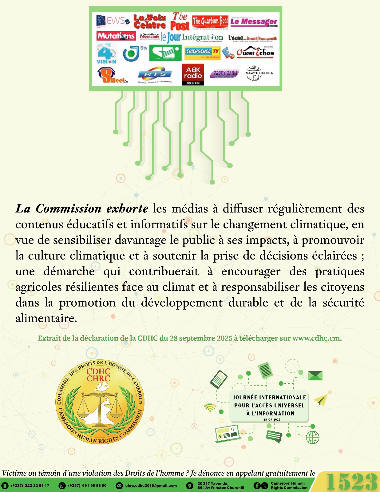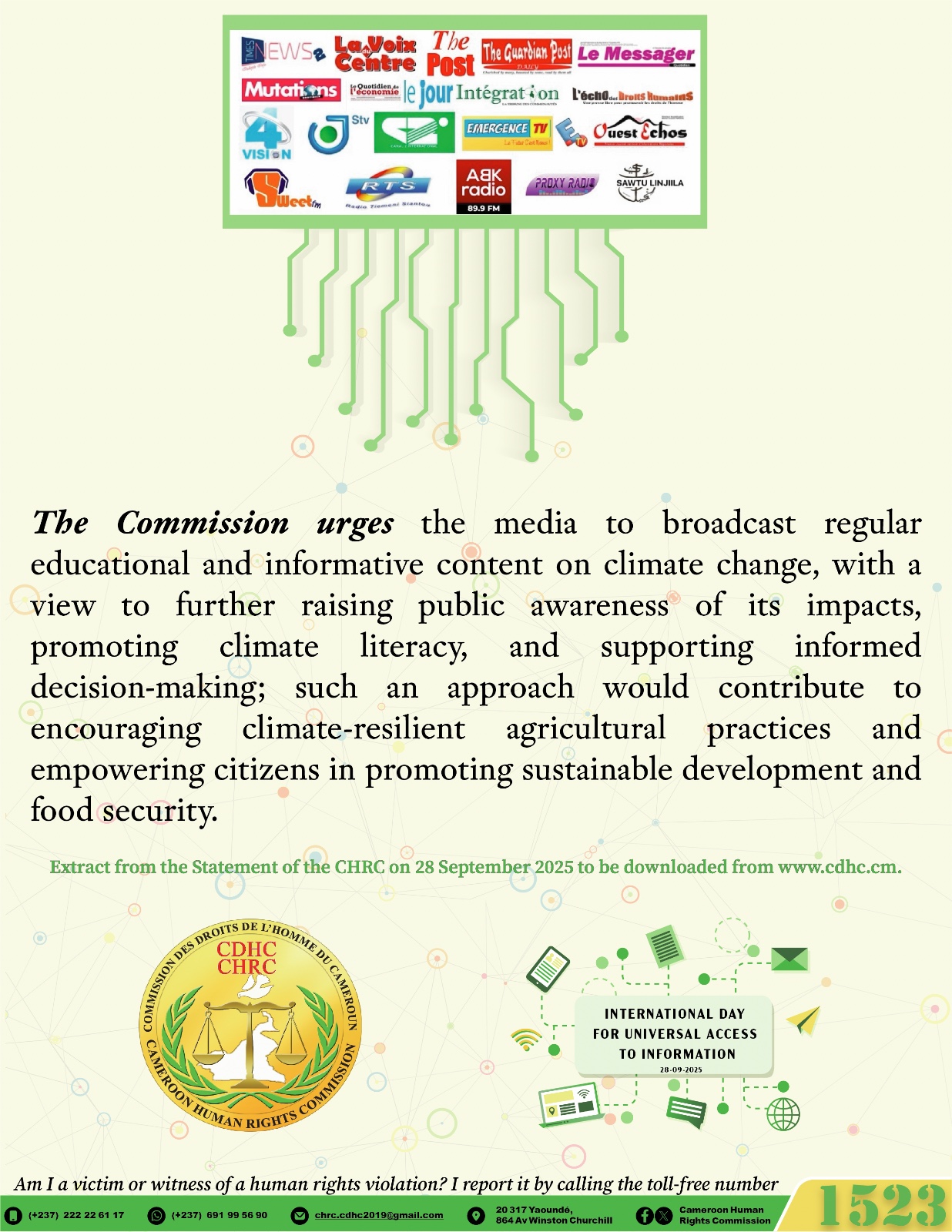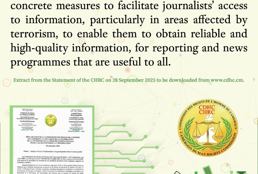 C’est dire pour la Commission des Droits de l’Homme de Cameroun, le thème de la Journée internationale de l’accès universel à l’information met l’accent sur le renforcement de l’accès à l’information comme pilier de la transparence, de la responsabilité ainsi que du développement durable tout en soulignant l’importance d’un accès rapide et complet à l’information environnementale dans un monde de plus en plus numérique, notamment dans un contexte marqué par le changement climatique, la pollution, la dégradation de la biodiversité et les risques de catastrophes.
