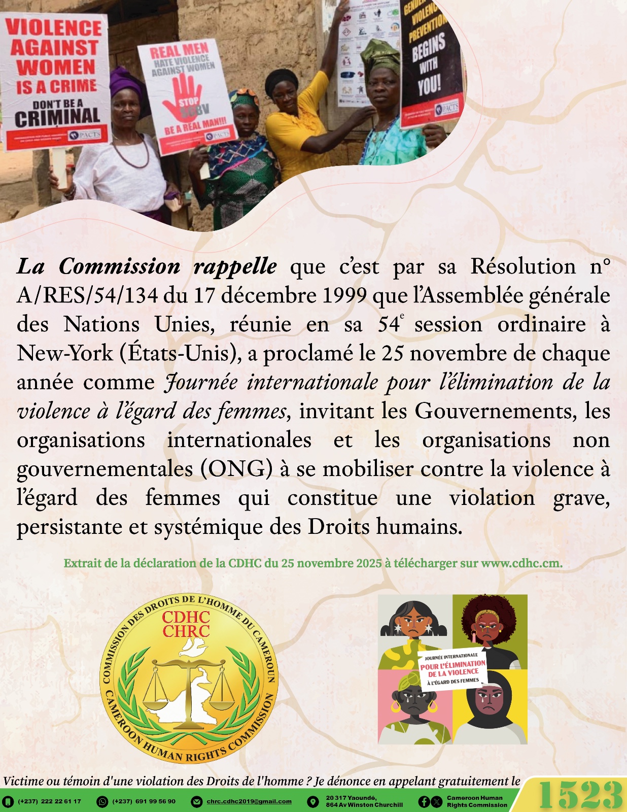 La Commission rappelle que c’est par sa Résolution n° A/RES/54/134 du 17 décembre 1999 que l’Assemblée générale des Nations Unies, réunie en sa 54e session ordinaire à New-York (États-Unis), a proclamé le 25 novembre de chaque année comme Journée internationale pour l’élimination de la violence à l’égard des femmes, invitant les Gouvernements, les organisations internationales et les organisations non gouvernementales (ONG) à se mobiliser contre la violence à l’égard des femmes qui constitue une violation grave, persistante et systémique des Droits humains.