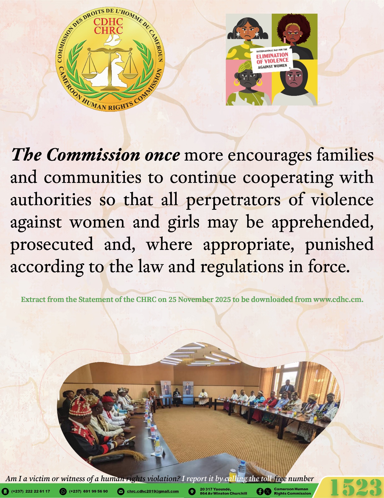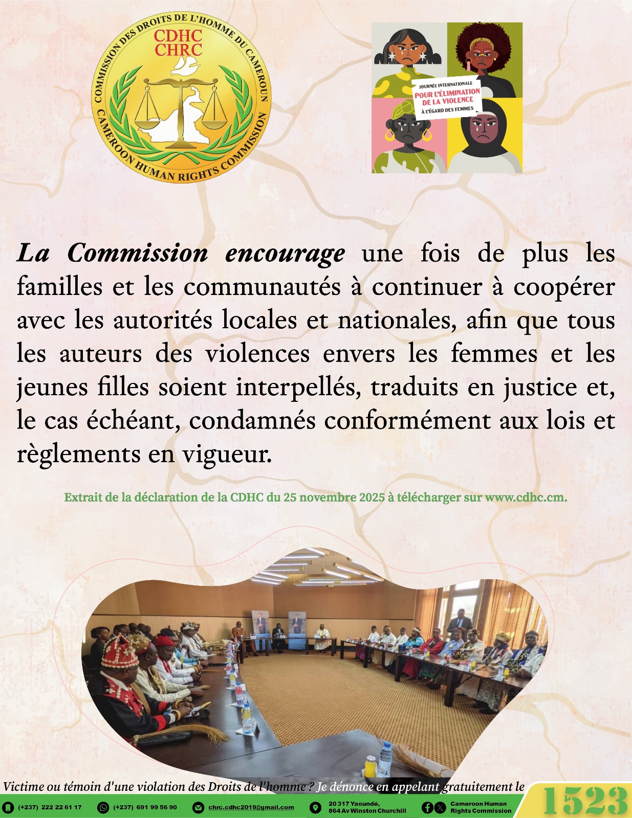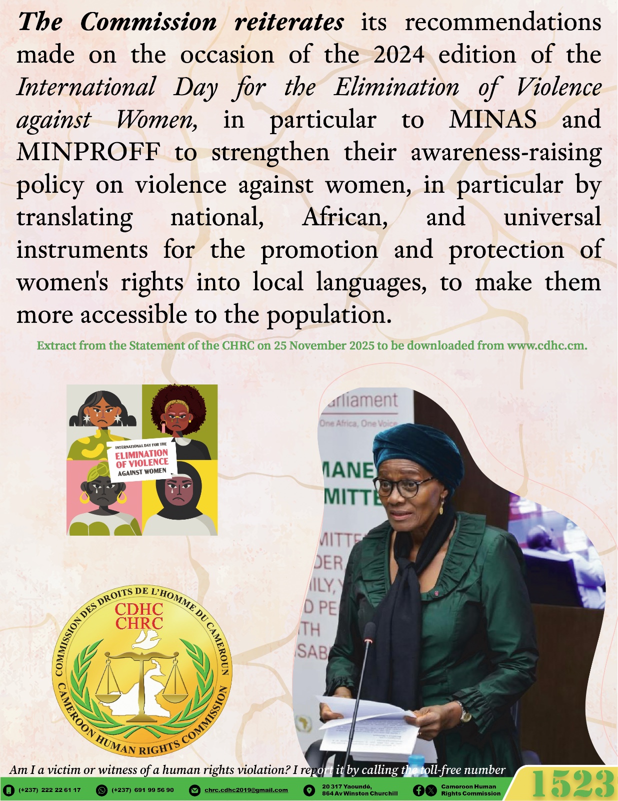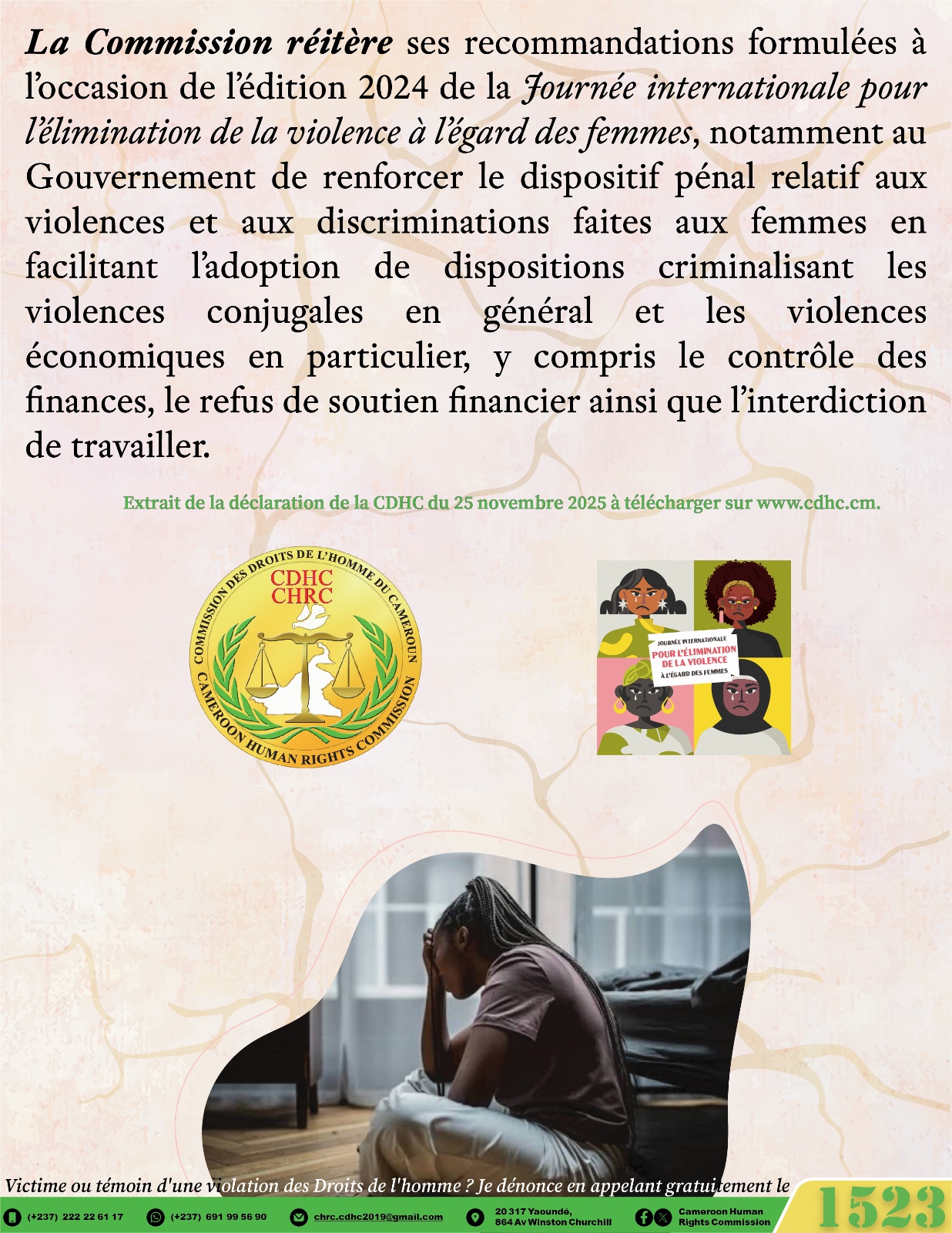 La Commission réitère ses recommandations formulées à l’occasion de l’édition 2024 de la Journée internationale pour l’élimination de la violence à l’égard des femmes, notamment au MINAS et au MINPROFF de renforcer leur politique de sensibilisation sur les violences à l’égard des femmes, notamment en traduisant les instruments nationaux, africains et universels de promotion et de protection des Droits des femmes dans les langues locales, pour une plus grande accessibilité aux populations.