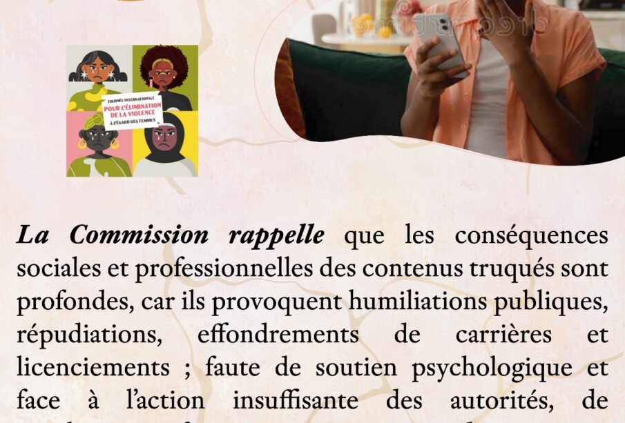La Commission rappelle que les conséquences sociales et professionnelles des contenus truqués sont profondes, car ils provoquent humiliations publiques, répudiations, effondrements de carrières et licenciements ; faute de soutien psychologique et face à l’action insuffisante des autorités, de nombreuses femmes se retirent des espaces numériques, creusant ainsi une véritable fracture numérique de genre.