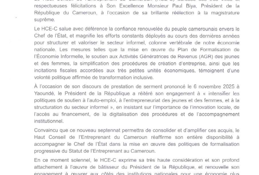 PRÉSIDENTIELLE 2025: LE HAUT CONSEIL DE L’ENTREPRENANT DU CAMEROUN (HCE-C) FÉLICITE LE CHEF DE L’ÉTAT ET APPELLE À LA CONSOLIDATION DES ACQUIS DU SECTEUR INFORMEL