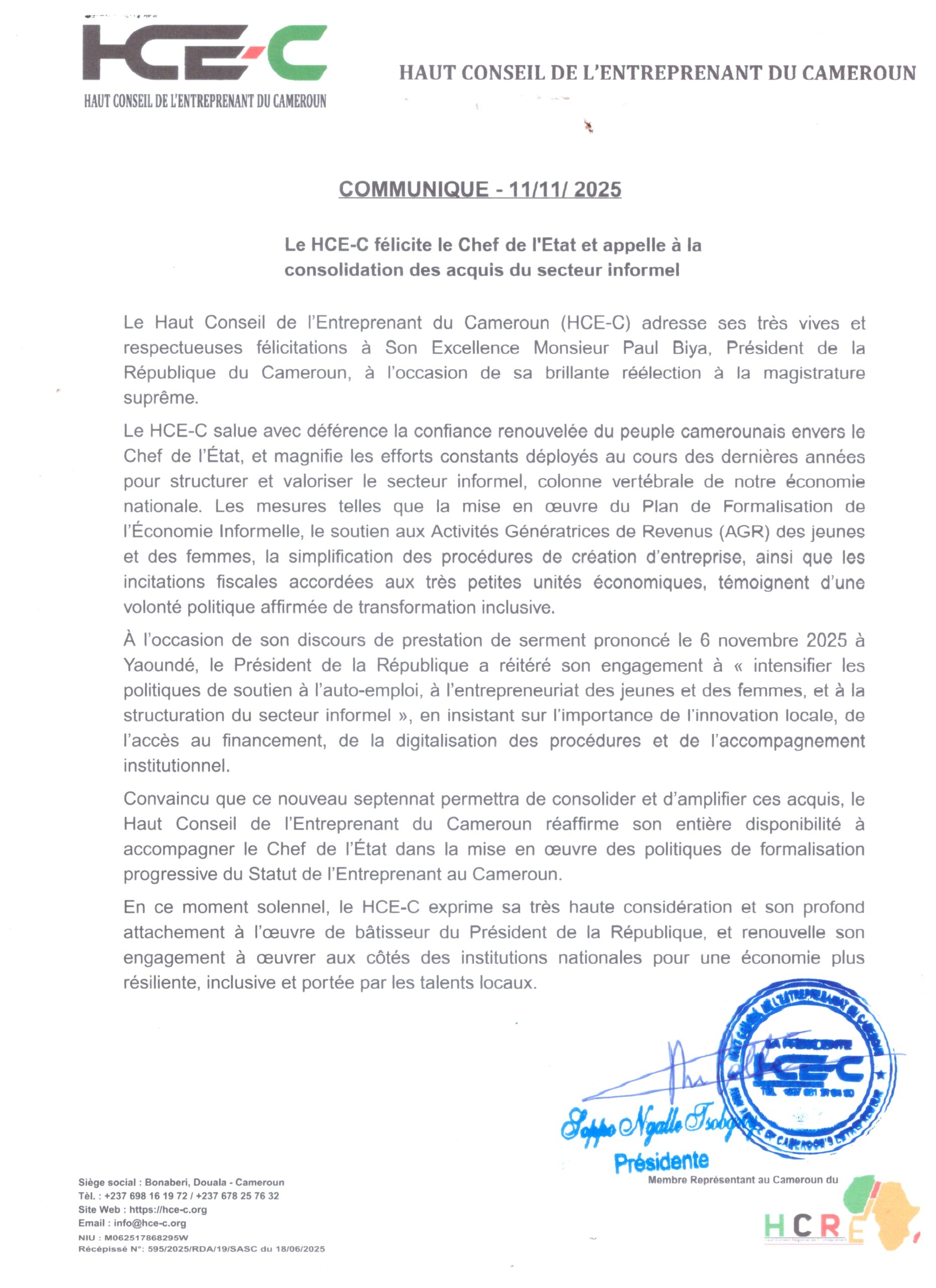 Dans un communiqué signé de la Présidente Brigitte Soppo Ngalle Épouse Tsobgny, le HCE-C salue avec déférence la confiance renouvelée du peuple camerounais, envers le Chef de l’État, et magnifie les efforts constants déployés au cours des dernières années pour structurer et valoriser le secteur informel, colonne vertébrale de l’économie nationale du Cameroun…